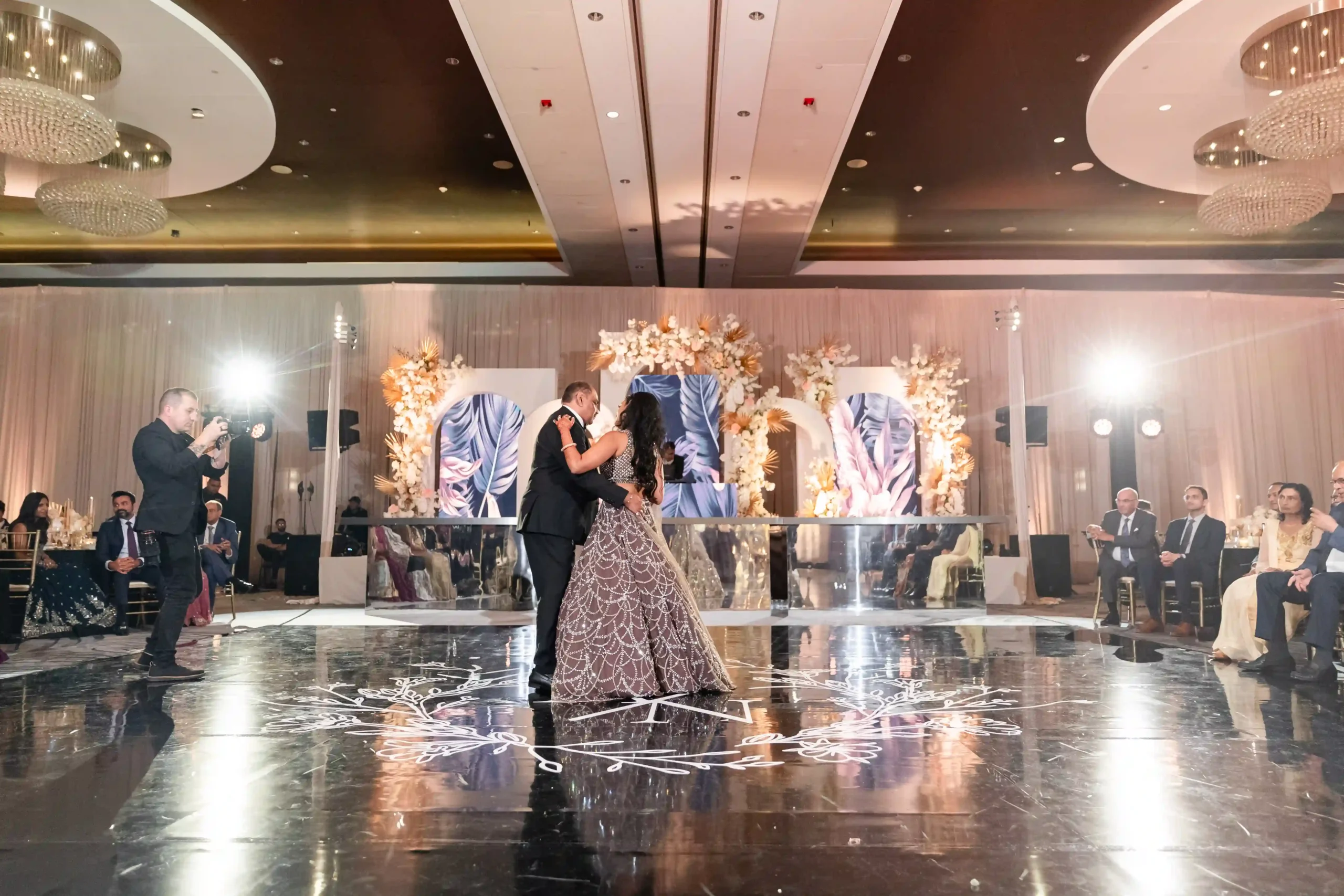 This dance floor was the centerpiece of the evening—fully customized and wrapped to reflect Nilesh & Avina’s personal style. Our team handled setup and breakdown, ensuring a stress-free experience so the couple and their guests could fully enjoy a night of dancing, laughter, and joyful celebration.